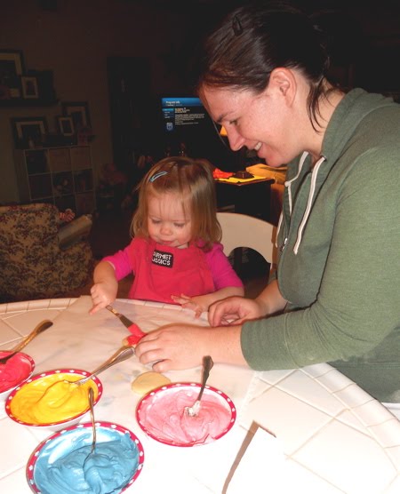 For Valentine's Day this year, Josephine and I had fun making heart-shaped cookies for Daddy. She had a ball putting icing on the cookies, but she had the MOST fun with the sprinkles. And by "fun" I mean "eating." We were still working on them when Caleb got home from work, but I'm pretty sure he enjoyed seeing her work on them more than the eating the cookies anyway. Happy Valentine's Day!